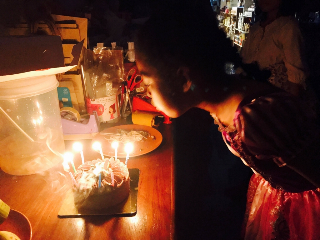 ろうそくに火をつけて、お歌を歌ってもらい、火を一気に娘が消しました。